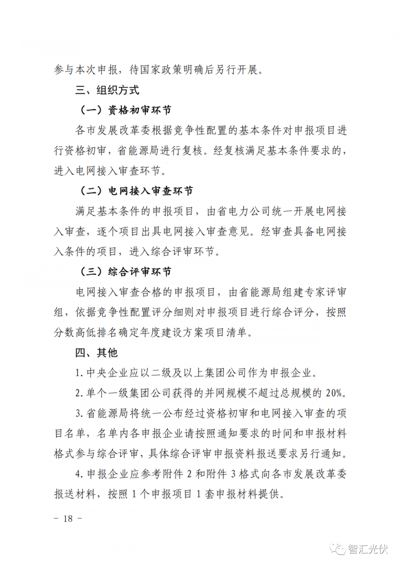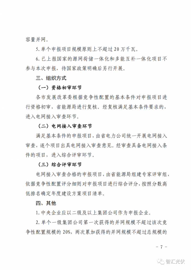 4)光伏項目:單個申報項目規(guī)模原則上不超過 20 萬千瓦。單個一級集團公司第一次獲得的并網(wǎng)規(guī)模不超過該次競爭性配置規(guī)模的 20%,兩次累加獲得的并網(wǎng)規(guī)模不超過總規(guī)模的20%。