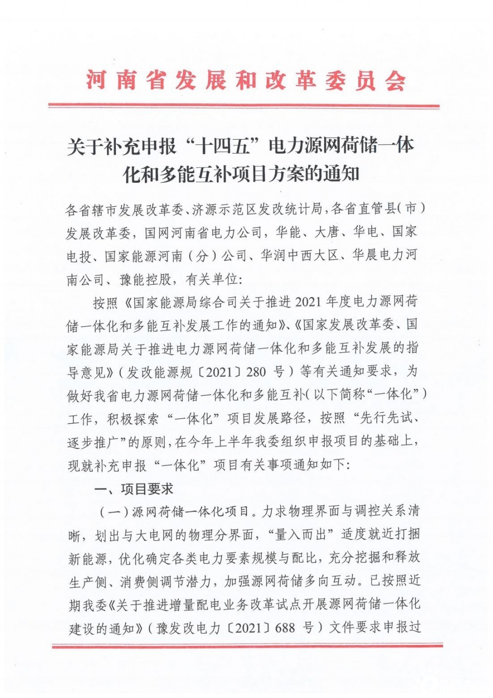 11月30日,河南省發(fā)改委發(fā)布了《關(guān)于補(bǔ)充申報(bào)“十四五”電力源網(wǎng)荷儲一體化和多能互補(bǔ)項(xiàng)目方案》的通知。按照“先行先試、逐步推廣”的原則,在今年上半年河南發(fā)改委組織申報(bào)項(xiàng)目的基礎(chǔ)上,再次補(bǔ)充申報(bào)“一體化”項(xiàng)目。