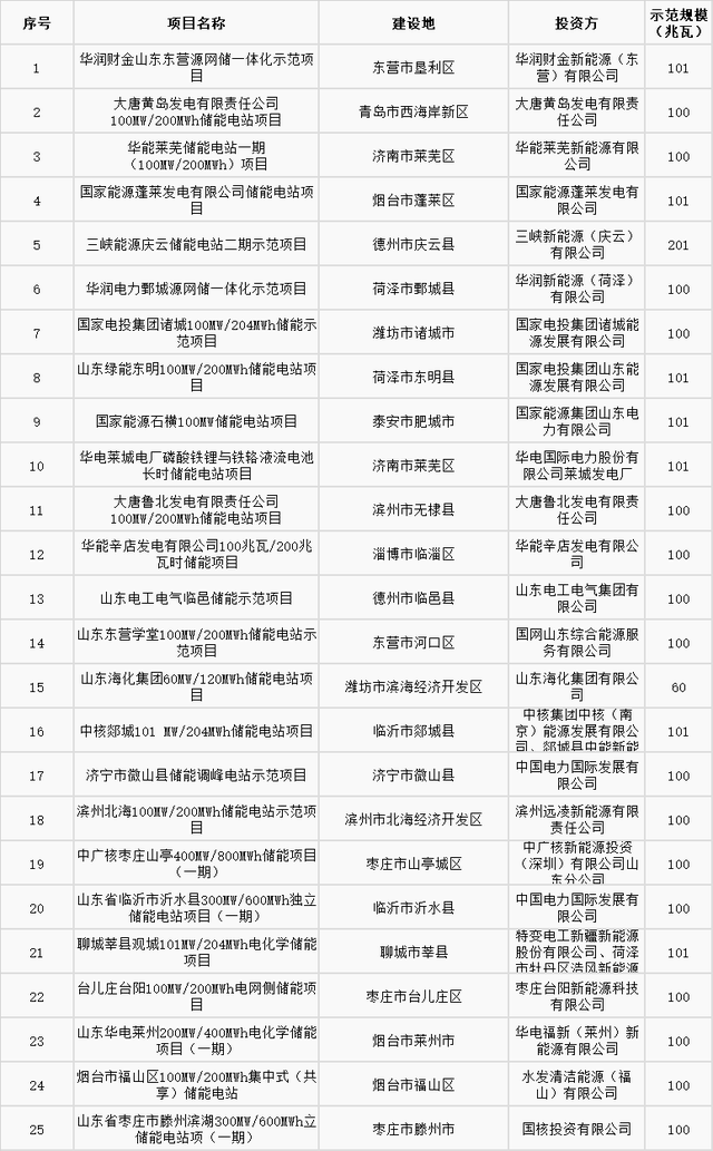 儲(chǔ)能在建設(shè)新型電力系統(tǒng)中具有重要地位,各地也紛紛布局儲(chǔ)能相關(guān)政策及示范項(xiàng)目,從而更好的推動(dòng)新型儲(chǔ)能建設(shè)的發(fā)展。4月7日,山東省能源局根據(jù)《關(guān)于開(kāi)展2022年度儲(chǔ)能示范項(xiàng)目遴選工作的通知》精神,經(jīng)各市推薦和專家評(píng)審,擬將25個(gè)鋰電池類項(xiàng)目、4個(gè)新技術(shù)類項(xiàng)目列為2022年度儲(chǔ)能示范項(xiàng)目(具體名單見(jiàn)表格)。