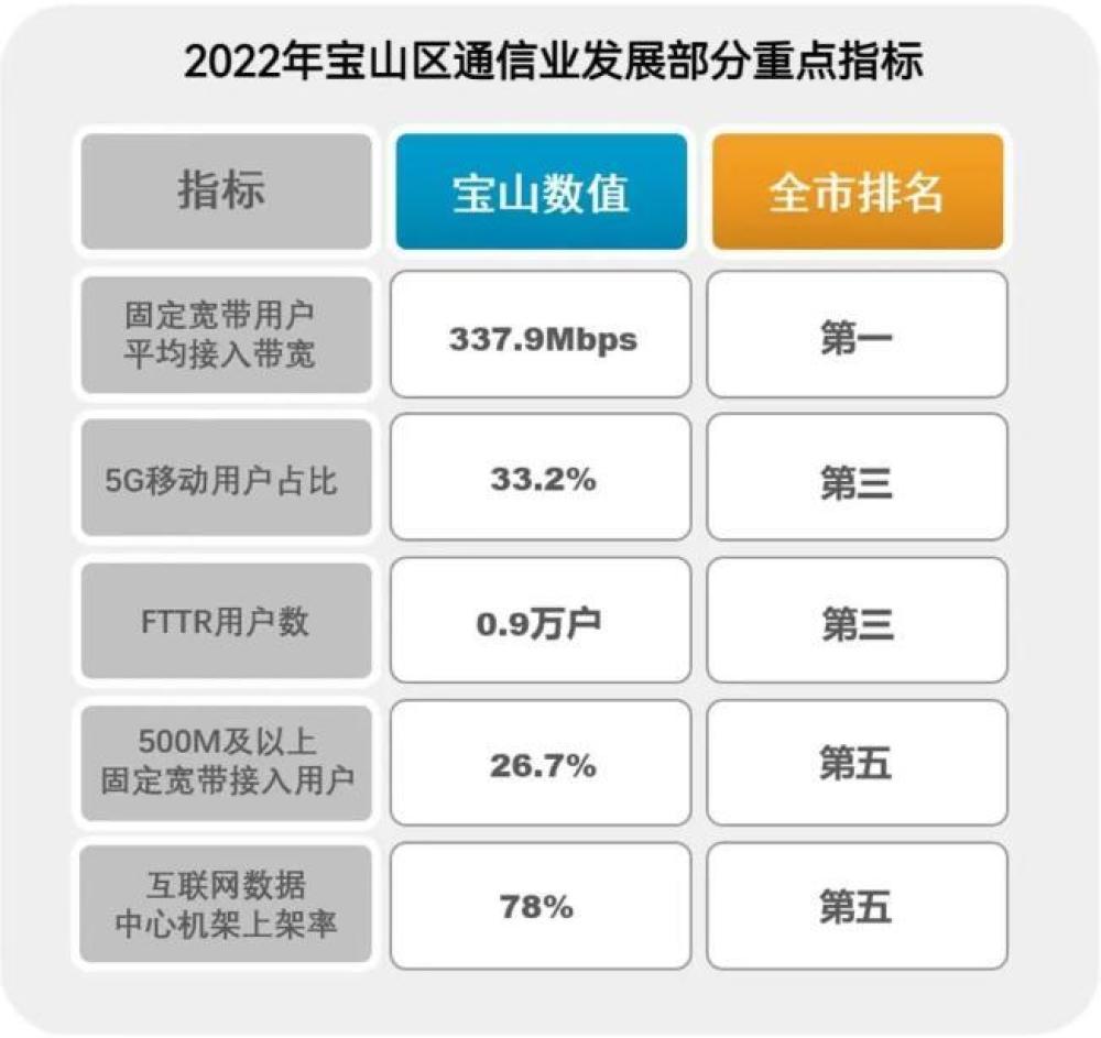 近日,市通信管理局發(fā)布《2022年上海市各行政區(qū)通信業(yè)發(fā)展重點(diǎn)指標(biāo)》,該指標(biāo)共計(jì)8項(xiàng),寶山5項(xiàng)指標(biāo)進(jìn)入全市前五,其中,寶山固定寬帶用戶平均接入帶寬位列全市第一,5G移動用戶、FTTR用戶數(shù)占比排名全市第三。