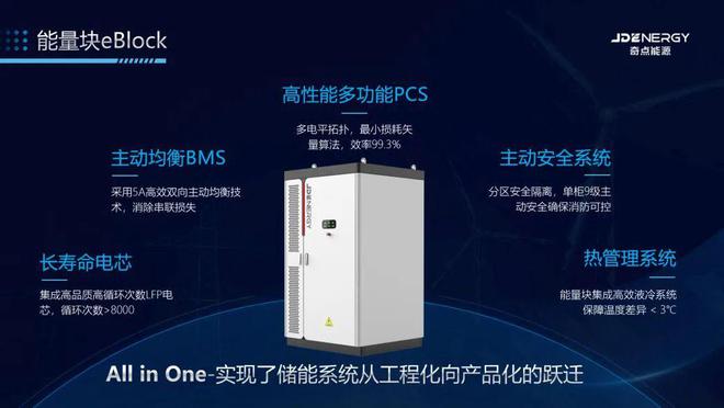 基于“all in one”的產(chǎn)品化設(shè)計(jì)理念,奇點(diǎn)能源能量塊eBlock創(chuàng)新性地將長壽命電芯、高效均衡BMS、高性能多功能PCS、主動(dòng)安全系統(tǒng)、高效熱管理系統(tǒng)融于單個(gè)戶外布署機(jī)柜,形成了一體化的智慧能量塊產(chǎn)品eBlock,為電化學(xué)儲(chǔ)能行業(yè)提供了一種全新的解決方案。其真正做到了把儲(chǔ)能工程轉(zhuǎn)化為標(biāo)準(zhǔn)化產(chǎn)品,定義了儲(chǔ)能系統(tǒng)集成新標(biāo)準(zhǔn)。