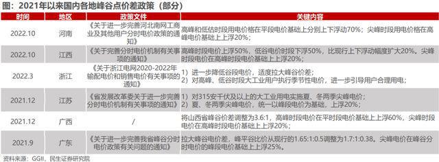 前面提到,終端看政策。2022年12月22日,國家發(fā)改委、國家能源局印發(fā)《關(guān)于做好2023年電力中長期合同簽訂履約工作的通知》,要求各地制定同本地電力供需和市場建設(shè)情況相適應(yīng)的中長期合同分時(shí)段價(jià)格形成機(jī)制,合理拉大峰谷價(jià)差,加強(qiáng)中長期與現(xiàn)貨價(jià)格機(jī)制銜接。自2021年下半年以來,全國已有河南、江西、浙江、河北、山西、廣東、山東等超過20個(gè)省市調(diào)整分時(shí)電價(jià)政策,要求適度拉大峰谷電價(jià)差水平。