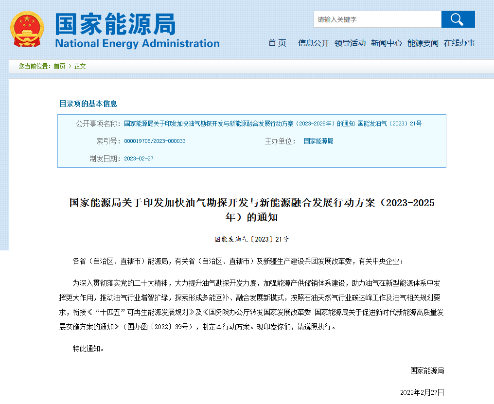 國家能源局3月22日公布關于印發(fā)加快油氣勘探開發(fā)與新能源融合發(fā)展行動方案(2023-2025年)的通知。其中提到,加快提升油氣上游新能源存儲消納能力。