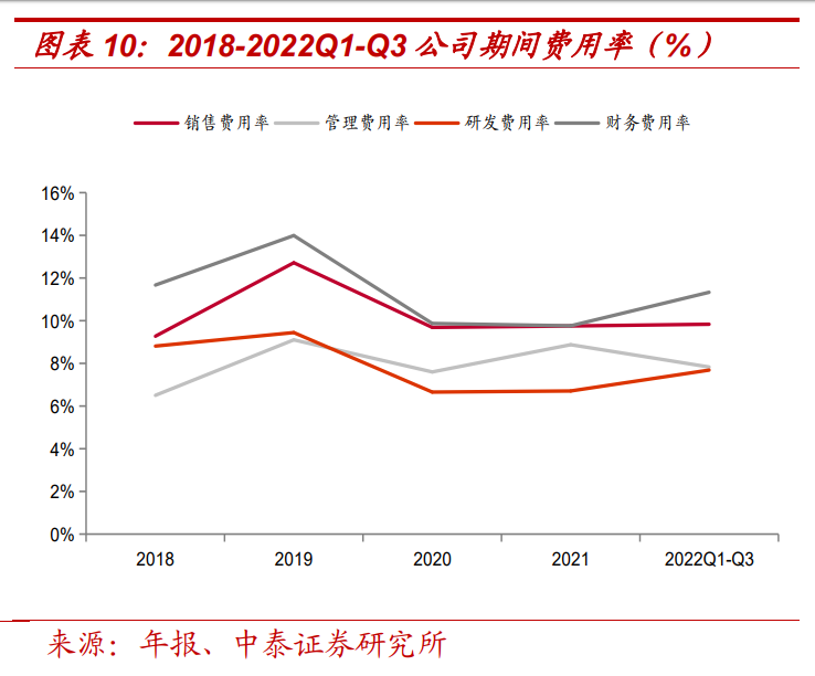 期間費(fèi)用呈下降趨勢,但仍有較大進(jìn)步空間。2019-2021 年公司期間費(fèi) 用率分別為 36.3%/45.3%/33.8%/35.1%/36.7%,雖然呈現(xiàn)總體下降趨勢, 但仍高于同行平均值,費(fèi)用管控能力有望進(jìn)一步提升。其中 2022 年前 三季度銷售/管理/研發(fā)/財(cái)務(wù)費(fèi)用率分別為 9.8%/7.8%/7.7%/11.3%,打破 前兩年的下降趨勢,主要是因?yàn)楣臼杖塍w量較低,規(guī)模效應(yīng)尚未體現(xiàn), 且公司近年來營運(yùn)資金緊缺,導(dǎo)致公司主動放棄大量周期長、墊資金額高的訂單,也限制了營收規(guī)模的增長,導(dǎo)致各方面人效降低。但隨著公 司業(yè)務(wù)擴(kuò)張的不斷推進(jìn)和資金鏈的緩解,期間費(fèi)用率有望好轉(zhuǎn)。