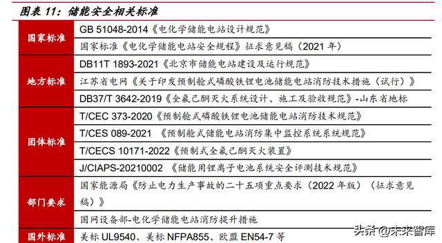 儲能電站裝機容量快速增長,儲能安全政策趨嚴。隨著大容量、高倍率的儲能系 統(tǒng)成為趨勢,儲能安全問題逐漸被重視。2014 年版國標(biāo)《電化學(xué)儲能電站設(shè)計規(guī)范》 已很難滿足快速發(fā)展的儲能安全需求,國家標(biāo)準(zhǔn)之外僅有部分企標(biāo)、團標(biāo)、地方標(biāo)準(zhǔn)、 美標(biāo) NFPA855、UL9540 等作為參考,國內(nèi)儲能安全標(biāo)準(zhǔn)仍需進一步規(guī)范。
