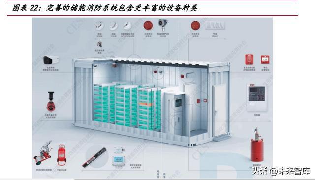 新標(biāo)準(zhǔn)對儲能安全標(biāo)準(zhǔn)提出更高要求。國家標(biāo)準(zhǔn) GB/T 42288-2022《電化學(xué)儲 能電站安全規(guī)程》已正式發(fā)布,將于 2023 年 7 月 1 日起正式實施。此前儲能安全領(lǐng) 域的老國標(biāo)系 2014 年發(fā)布,在消防領(lǐng)域主要規(guī)范了建筑物和設(shè)備防火等級、消防水 池和砂池的配置,探測和預(yù)警方面提出“應(yīng)設(shè)置火災(zāi)自動報警系統(tǒng)”和“宜配置感煙 探測器和可燃氣體報警裝置”。2021 年出臺的新國標(biāo)征求意見稿,開始引入“自動滅 火系統(tǒng)”、“電池模塊級消防”、“多系統(tǒng)聯(lián)動”、“抑制復(fù)燃”等概念。此次新國標(biāo)正式 發(fā)布,相較征求意見稿進一步趨嚴,新增了“每個電池模塊可單獨配置探測器”的表 述;“且防止復(fù)燃”的表述升級為“持續(xù)抑制復(fù)燃”。