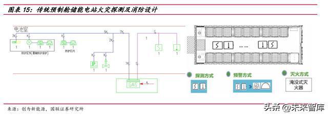 當(dāng)前儲能系統(tǒng)火災(zāi)探測及消防設(shè)計存在不足。目前預(yù)置艙儲能電站火災(zāi)探測報 警系統(tǒng)參照 GB 50116《火災(zāi)自動報警系統(tǒng)設(shè)計規(guī)范》,配置使用點型感溫和感煙探 測器,消防預(yù)警系統(tǒng)采用獨立的通訊方式,主要存在三點不足: 1)探測部分:配置的點型感溫和點型感煙探測器,只有在煙氣和溫度已經(jīng)蔓延 到艙室后才能起到報警作用,不適用于鋰離子電池?zé)崾Э卦缙陬A(yù)警,屬于電池?zé)釘U散 事故發(fā)生后的火災(zāi)報警。 2)火災(zāi)抑制部分:在整個預(yù)制艙內(nèi)做淹沒式的滅火藥劑噴放,滅火藥劑無法作 用于發(fā)生熱失控的電池箱內(nèi)部,不能起到定向撲滅火災(zāi)的作用。 3)聯(lián)動部分:傳統(tǒng)消防作為獨立運行的系統(tǒng),無法與 BMS 或 EMS 系統(tǒng)通訊形 成有效聯(lián)動。