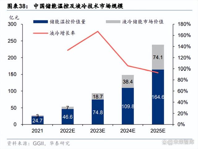 液冷針對大儲優(yōu)勢凸顯,未來市場規(guī)模將快速提升。液冷在技術(shù)上具備優(yōu)勢,當(dāng)前大容量、 高功率儲能系統(tǒng)的快速應(yīng)用,對于儲能系統(tǒng)散熱效率要求更高。液冷技術(shù)相比于傳統(tǒng)風(fēng)冷 散熱效率更高,同時(shí)噪音更小、能耗更低,具有顯著優(yōu)勢,單位價(jià)值量相比風(fēng)冷也會有明 顯提升。隨著儲能電站大型化、集約化的不斷發(fā)展,儲能系統(tǒng)大容量、高密度的趨勢不斷 凸顯,未來液冷市場規(guī)模預(yù)計(jì)會快速增長。根據(jù) GGII,2021 年中國儲能溫控市場整體規(guī)模 為 24.7 億元,液冷溫控市場規(guī)模 3 億元。GGII 預(yù)計(jì)到 2025 年,中國儲能溫控市場總規(guī)模 將達(dá)到 164.6 億元,液冷儲能市場價(jià)值將達(dá)到 74.1 億元,占比約 45.1%,年復(fù)合增長率超 過 89%。