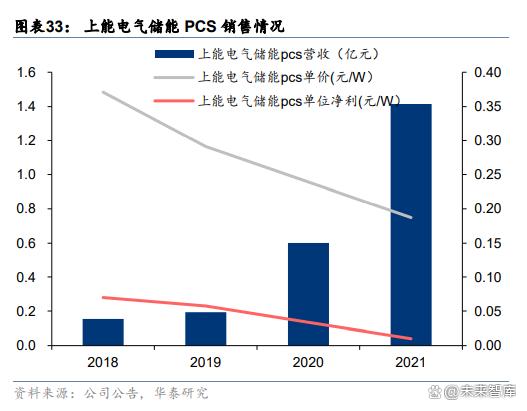 大儲是 B 端市場,廠商價(jià)格直面競爭,產(chǎn)品優(yōu)勢公司脫穎而出。儲能 PCS 在初期單價(jià)和毛 利率較高,隨著頭部廠商不斷擴(kuò)產(chǎn)和新的廠商不斷進(jìn)入,產(chǎn)業(yè)競爭加劇,價(jià)格和毛利率逐 漸走低。上能電氣 2018 年儲能 PCS 營收 0.15 億元,產(chǎn)品單價(jià) 0.37 元/W,2022 年儲能 PCS 營收 1.42 億元,較 2018 年增長近 9 倍,產(chǎn)品單價(jià) 0.19 元/W,降幅 50%,規(guī)模效應(yīng) 盡顯。陽光電源光伏逆變器價(jià)格穩(wěn)中有降,由 2018 年 0.22 元/W 降至 2022 年 0.19 元/W。