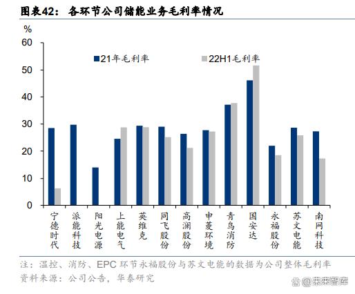 各環(huán)節(jié) 22H1 毛利率相比 21 年全年普遍走低,消防環(huán)節(jié)毛利率水平最高。21 年電芯環(huán)節(jié) 兩家企業(yè)儲能業(yè)務(wù)毛利率處于 28%-30%,22H1 受到上游鋰礦價(jià)格高漲且傳導(dǎo)滯后影響, 盈利空間被顯著壓縮,以寧德時(shí)代為例,22H1 毛利率下滑至 6.43%。消防環(huán)節(jié)毛利率最高, 且兩家公司 22H1 毛利率相比 21 年均有提升,我們認(rèn)為主要系公司產(chǎn)品結(jié)構(gòu)優(yōu)化致整體毛 利率水平抬升。儲能 PCS 及系統(tǒng)集成環(huán)節(jié)內(nèi)各公司由于業(yè)務(wù)結(jié)構(gòu)及出貨市場的不同毛利率 水平差異較大,陽光電源/上能電氣 2021 年儲能業(yè)務(wù)毛利率水平分別為 14.11% /24.52%。 溫控環(huán)節(jié)毛利率普遍在 25%-30%之間。EPC 環(huán)節(jié) 21 年毛利率普遍在 20%-30%之間,22H1 毛利率水平出現(xiàn)明顯下滑。