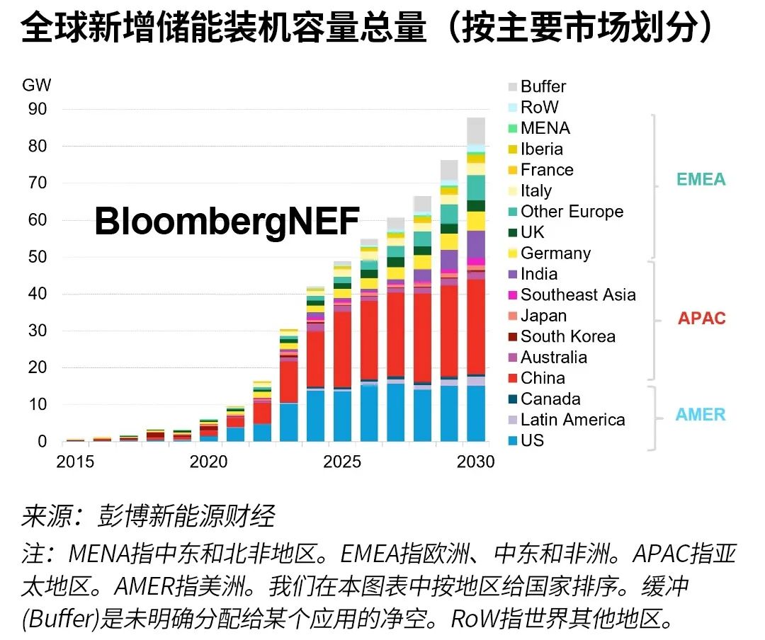 按GW計(jì),到2030年美洲地區(qū)將占到年度儲(chǔ)能裝機(jī)容量的21%。受加州、西南部和德克薩斯州的一系列大型項(xiàng)目帶動(dòng),美國(guó)是迄今為止最大的市場(chǎng)。由于電池成本上升,美國(guó)出現(xiàn)了一波項(xiàng)目延遲。盡管如此,美國(guó)公用事業(yè)公司繼續(xù)采購(gòu)與光伏配套的儲(chǔ)能,以提高系統(tǒng)可靠性。與此同時(shí),一些長(zhǎng)時(shí)儲(chǔ)能項(xiàng)目獲得發(fā)展動(dòng)力。智利市場(chǎng)改革可能為拉丁美洲新興儲(chǔ)能市場(chǎng)新增裝機(jī)容量加速鋪平道路。智利和巴西各地光伏和風(fēng)電裝機(jī)容量迅速增長(zhǎng),墨西哥電網(wǎng)投資不足,這可能為儲(chǔ)能提供機(jī)會(huì)。