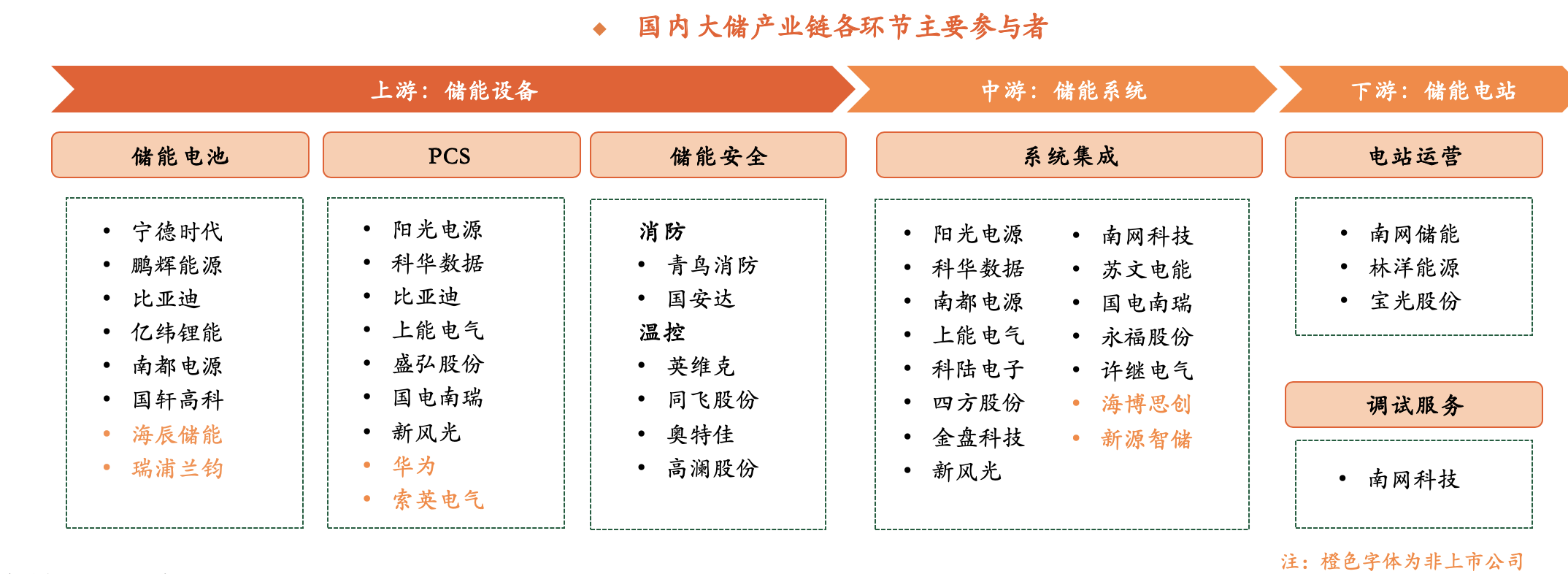 大儲(chǔ)產(chǎn)業(yè)鏈主要包括上游儲(chǔ)能設(shè)備、中游系統(tǒng)集成、下游電站等環(huán)節(jié)。儲(chǔ)能電池和PCS是大儲(chǔ)產(chǎn)業(yè)鏈價(jià)值量最大的兩個(gè)環(huán)節(jié),陳驍?shù)热苏J(rèn)為,儲(chǔ)能電池絕對(duì)龍頭寧德時(shí)代,第二梯隊(duì)比亞迪、鵬輝能源、億緯鋰能、國軒高科、南都電源、海辰儲(chǔ)能等有望借國內(nèi)大儲(chǔ)市場(chǎng)加速贏得動(dòng)力電池之外的第二成長曲線。國內(nèi)大儲(chǔ)PCS頭部企業(yè)陽光電源、科華數(shù)據(jù)、上能電氣、盛弘股份、國電南瑞、新風(fēng)光等在裝機(jī)提速+毛利改善下業(yè)績(jī)有望受益。