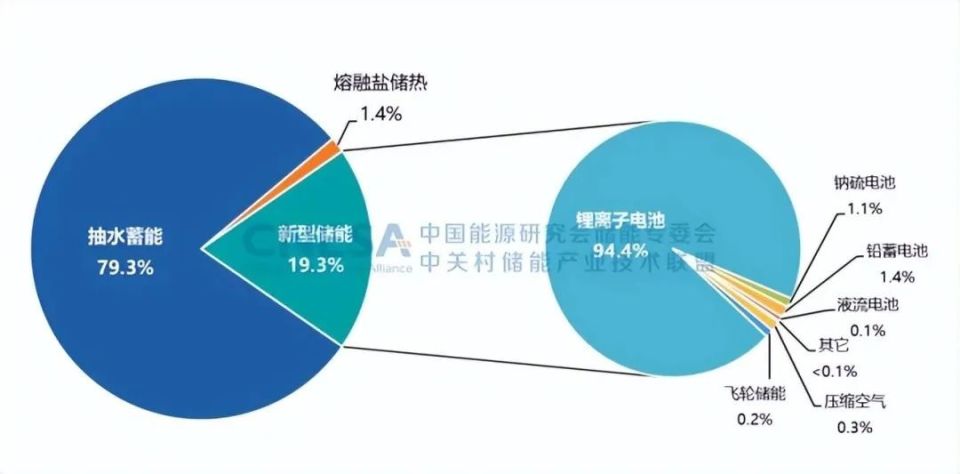 2022年,中國新增投運電力儲能項目裝機規(guī)模首次突破15GW,達到16.5GW,其中,抽水蓄能新增規(guī)模9.1GW,同比增長75%;新型儲能新增規(guī)模創(chuàng)歷史新高,達到7.3GW/15.9GWh,功率規(guī)模同比增長200%,能量規(guī)模同比增長280%;新型儲能中,鋰離子電池占據(jù)絕對主導地位,比重達97%,此外,壓縮空氣儲能、液流電池、鈉離子電池、飛輪等其它技術路線的項目,在規(guī)模上有所突破,應用模式逐漸增多。