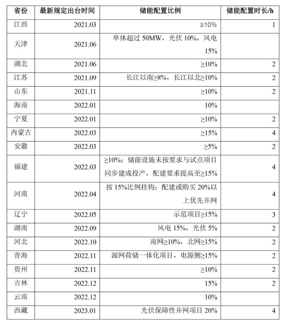 為響應上述國家政策的號召,在地方層面,已有多地有關部門因地制宜地推出了新能源項目(主要為風電、光伏電站)的強制配儲政策,部分列示如下:
