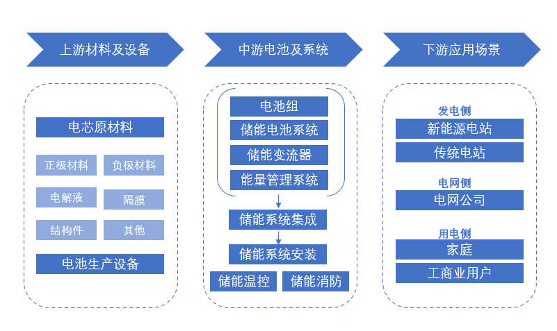 從整個產(chǎn)業(yè)鏈角度看,儲能產(chǎn)業(yè)鏈上游主要為材料及設備供應,中游主要為儲能系統(tǒng)的集成與制造,下游主要為電力系統(tǒng)儲能、備用電源及其他領域等。