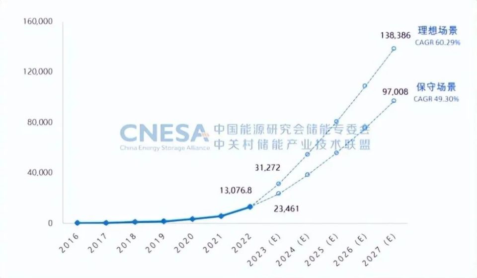 經(jīng)歷“十三五”孕育,“十四五”時期,我國新型儲能市場有望邁上新臺階。2021開始,我國新型儲能從商業(yè)化初期向規(guī)?;l(fā)展,根據(jù)CNESA預測,在未來5年,“新能源+儲能”是新型儲能的主要應用場景,政策推動將構(gòu)成中國儲能市場的主要增長動力;根據(jù)中國能源研究會儲能專委會/中關村儲能產(chǎn)業(yè)技術聯(lián)盟(CNESA)全球儲能數(shù)據(jù)庫的不完全統(tǒng)計,截至2022年底,國內(nèi)已投運的電力儲能項目累計裝機達59.8GW,占全球市場總規(guī)模的25%,年增長率38%,其中新型儲能持續(xù)高速發(fā)展,累計裝機規(guī)模首次突破10GW,累計裝機規(guī)模首次突破10GW,達到13.1GW/27.1GWh。未來5年,“新能源+儲能”是新型儲能的主要應用場景,政策推動是主要增長動力;根據(jù)中關村儲能產(chǎn)業(yè)技術聯(lián)盟(CNESA)對我國新型儲能未來5年市場規(guī)模的預測,保守場景下,預計2027年新型儲能累計規(guī)模將達到97.0GW,2023-2027年復合年均增長率(CAGR)為49.3%;理想場景下,預計2027年新型儲能累計規(guī)模將達到138.4GW,2023-2027年復合年均增長率(CAGR)為60.3%。預計未來5年,年度新增儲能裝機呈平穩(wěn)上升趨勢。保守場景下,年平均新增儲能裝機為16.8GW;理想場景下,年平均新增儲能裝機為25.1GW。