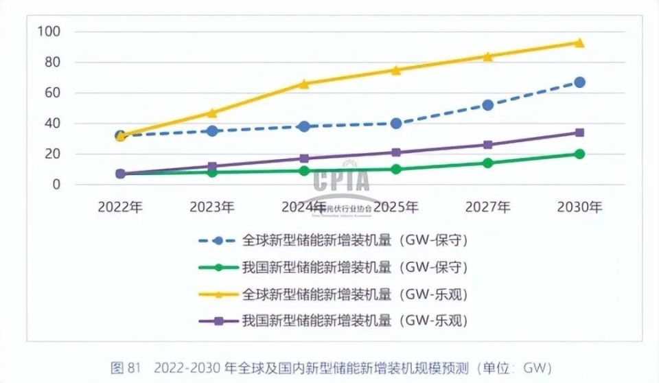 據(jù)中國光伏行業(yè)協(xié)會(CPIA)的統(tǒng)計,2022年全球及國內(nèi)新型儲能新增裝機約為32GW、7GW,創(chuàng)歷史新高。隨著政策執(zhí)行、成本下降和技術改進,新型儲能將更能滿足發(fā)電側(cè)、電網(wǎng)側(cè)、用戶側(cè)的電力儲能需求。預計2025年,全球及我國新型儲能年度新增裝機或分別超過40GW、10GW,有望達到75GW、21GW。