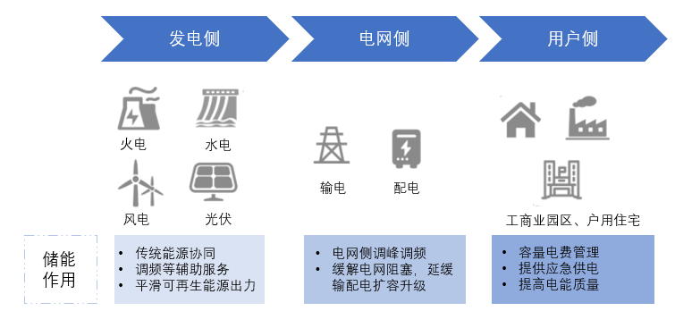 從整個電力系統(tǒng)的角度看,儲能的應用場景可分為發(fā)電側(cè)儲能、電網(wǎng)側(cè)儲能和用戶側(cè)儲能三大場景。其中,發(fā)電側(cè)對儲能的需求場景類型較多,包括可再生能源并網(wǎng)、電力調(diào)峰、系統(tǒng)調(diào)頻等;電網(wǎng)側(cè)儲能主要發(fā)揮支撐電力保供、提升系統(tǒng)調(diào)節(jié)能力、支撐新能源高比例外送以及替代輸配電工程投資等作用;用戶側(cè)儲能主要用于電力自發(fā)自用、峰谷價差套利、容量電費管理和提高供電可靠性等。然而,在實際應用中,儲能的某一功能應用并不局限于單一應用場景,以平滑輸出、跟蹤出力計劃為例,可同時應用于發(fā)電側(cè)、電網(wǎng)側(cè)和用戶側(cè)。