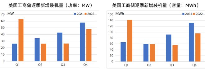 根據(jù)Wood Mackenzie數(shù)據(jù)顯示,2022年美國新增工商儲裝機容量為164MW/354MWh,同比+1%/+1%。其中,2022Q4新增48MW/96MWh,同比-17%/-27%,環(huán)比+80%/+71%。