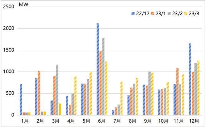 對比前期(22/12、23/1、23/2)數(shù)據(jù),發(fā)現(xiàn)2023年Q1各月儲能投運延期較為顯著,推測延期原因主要系供應(yīng)鏈問題和并網(wǎng)排隊等。根據(jù)各期數(shù)據(jù),上半年仍有投運小高峰,我們分析認(rèn)為這是因為每年7-8月是美國夏季負(fù)荷高峰,是儲能獲取收益的重要月份,因此6月底前是儲能項目投運的重要時間節(jié)點。