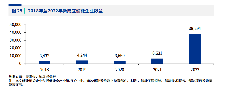 最近,特斯拉儲能超級工廠落戶上海、知名酒企五糧液擬跨界儲能,小米、華為等企業(yè)均增設(shè)部門聚焦,儲能賽道可謂是炙手可熱,無論是在制造環(huán)節(jié),還是在終端應(yīng)用市場,數(shù)萬家企業(yè)正搶占布局。據(jù)畢馬威中國與中國電力企業(yè)聯(lián)合會聯(lián)合發(fā)布的《新型儲能助力能源轉(zhuǎn)型》顯示,2021年之前,我國每年新成立的儲能相關(guān)企業(yè)大約在三四千家。隨著儲能行業(yè)的迅速升溫,2022年成立了38294家儲能相關(guān)企業(yè),是2020年新成立儲能企業(yè)數(shù)量的10倍,是2021年的近6倍。