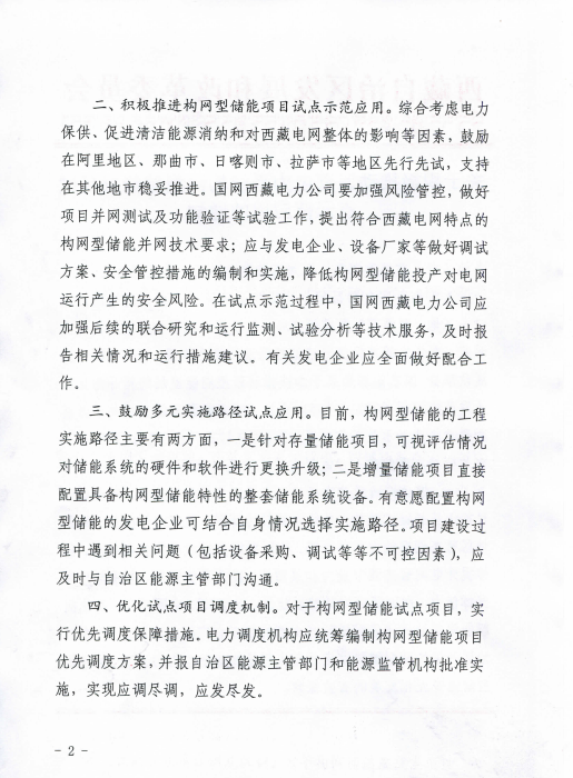 積極推進(jìn)構(gòu)網(wǎng)型儲(chǔ)能項(xiàng)目試點(diǎn)示范應(yīng)用。綜合考慮電力保供、促進(jìn)清潔能源消納和對(duì)西藏電網(wǎng)整體的影響等因素,鼓勵(lì)在阿里地區(qū)、那曲市、日喀則市、拉薩市等地區(qū)先行先試,支持在其他地市穩(wěn)妥推進(jìn)。國(guó)網(wǎng)西藏電力公司要加強(qiáng)風(fēng)險(xiǎn)管控,做好項(xiàng)目并網(wǎng)測(cè)試及功能驗(yàn)證等試驗(yàn)工作,提出符合西藏電網(wǎng)特點(diǎn)的構(gòu)網(wǎng)型儲(chǔ)能并網(wǎng)技術(shù)要求;應(yīng)與發(fā)電企業(yè)、設(shè)備廠家等做好調(diào)試方案、安全管控措施的編制和實(shí)施,降低構(gòu)網(wǎng)型儲(chǔ)能投產(chǎn)對(duì)電網(wǎng)運(yùn)行產(chǎn)生的安全風(fēng)險(xiǎn)。