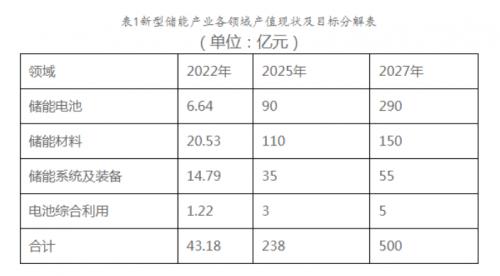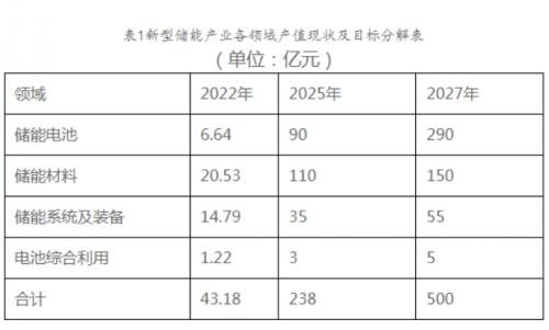文件明確,到2027年,新型儲能產(chǎn)業(yè)產(chǎn)值規(guī)模超500億元,儲能電池產(chǎn)能達40GWh,新型儲能電站裝機規(guī)模達260萬千瓦以上。力爭培育產(chǎn)值超過100億元企業(yè)1家以上,超50億元企業(yè)5家以上,超10億元企業(yè)10家以上。