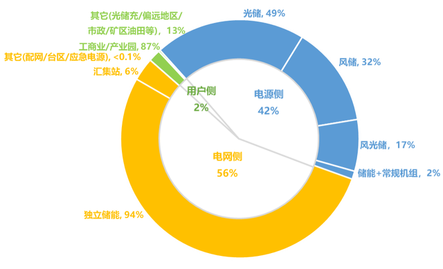 中國新增投運(yùn)新型儲能項(xiàng)目應(yīng)用裝機(jī)分布(2023年1-6月份,MW%)