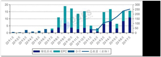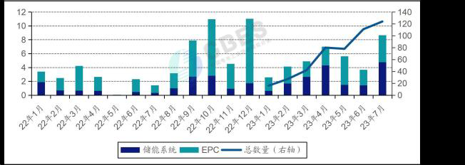 中國電池工業(yè)協(xié)會儲能分會近日發(fā)布的2023中國新型儲能7月研究簡報顯示,儲能市場持續(xù)火熱,7 月儲能系統(tǒng)招標(biāo)規(guī)模創(chuàng)歷史新高。分會共統(tǒng)計到儲能招標(biāo)項目252個,總規(guī)模達到15.8GWh ,環(huán)比增長1% ,同比增長425% 。其中,儲能EPC項目共計171個,規(guī)模為4.9GWh ,儲能系統(tǒng)項目共計81個,規(guī)模為10.9GWh。