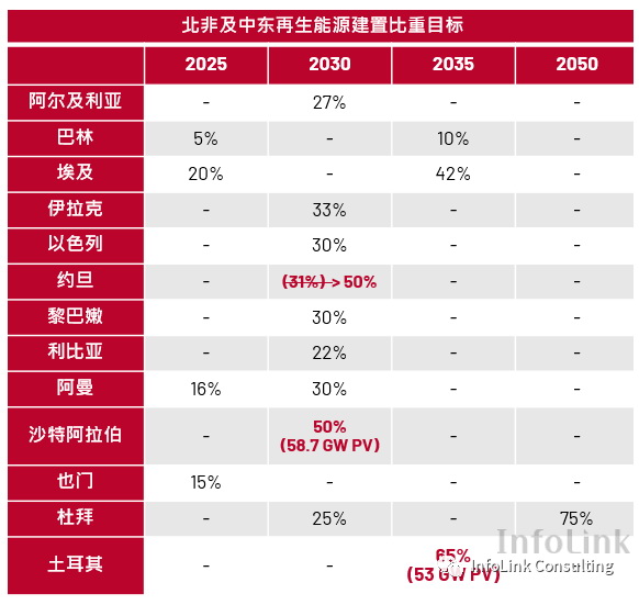 由于既有較成熟市場(chǎng)的商業(yè)模式與供應(yīng)鏈成型,進(jìn)入門坎拉高也更為競(jìng)爭(zhēng),因此新興市場(chǎng)如東南亞、中東、南美、非洲等成為企業(yè)欲搶占布局之區(qū),且受到光伏市場(chǎng)的刺激會(huì)帶動(dòng)儲(chǔ)能維持熱度與需求,應(yīng)用面今年則以表后工商業(yè)更受關(guān)注。然而,大部分此些市場(chǎng)的政策、程序、供應(yīng)鏈、再生能源規(guī)模、電網(wǎng)、建設(shè)環(huán)境等都遠(yuǎn)不如較成熟市場(chǎng),相對(duì)也就需要更長(zhǎng)的爬坡期且影響發(fā)展速率變量更多,導(dǎo)致該市場(chǎng)可能大幅起落。例如,新興市場(chǎng)目前出臺(tái)的政策多是以整體再生能源建置為目標(biāo),對(duì)于儲(chǔ)能的需求或發(fā)展尚無明確指引,以下表整理的北非與中東為例;其次,中國(guó)六月份的儲(chǔ)能裝機(jī)規(guī)模中工商業(yè)占比僅1%,說明市場(chǎng)需求與情緒雖旺盛,但實(shí)際規(guī)模需更審慎評(píng)估。
