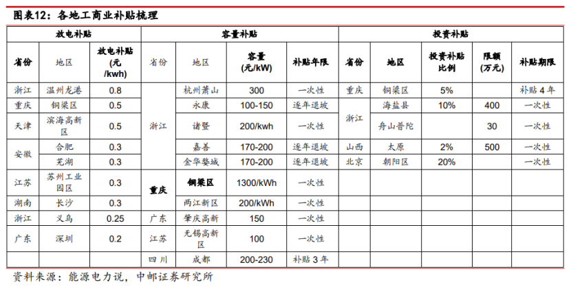 另外,2022年以來,工商業(yè)儲(chǔ)能直接補(bǔ)貼政策頻發(fā),鼓勵(lì)分布式光伏配儲(chǔ),補(bǔ)貼方式包括容量補(bǔ)貼、放電補(bǔ)貼和投資補(bǔ)貼等。