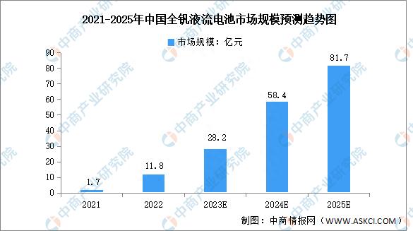 全釩液流電池的市場空間主要來自于儲能需求的增長以及自身滲透率的提升,隨著技術(shù)的進(jìn)步及生產(chǎn)成本的降低,全釩液流電池市場空間將逐步擴(kuò)大。數(shù)據(jù)顯示,2022年全釩液流電池市場規(guī)模約11.8億元,中商產(chǎn)業(yè)研究院分析師預(yù)測,2023年我國全釩液流電池市場規(guī)模將達(dá)28.2億元,預(yù)計(jì)2025年將增至81.7億元,2021-2025年復(fù)合年均增長率達(dá)163.3%。