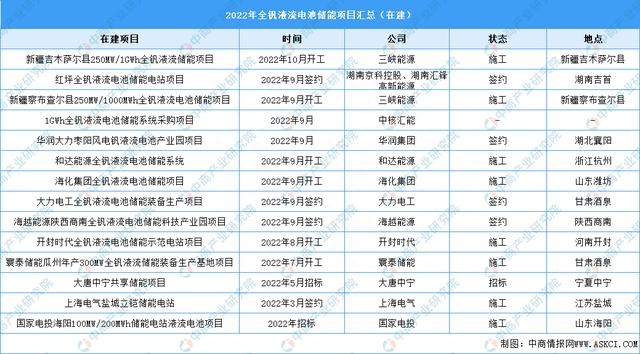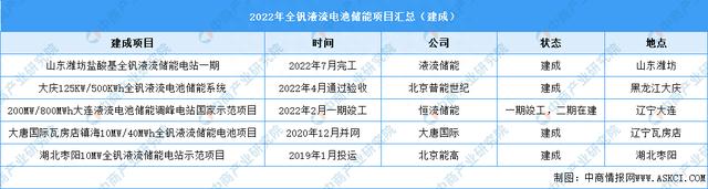 全釩液流電池具有響應(yīng)快、安全環(huán)保、壽命長、規(guī)模大等特點(diǎn),適合長時(shí)儲能,市場發(fā)展空間廣闊。2022年,我國全釩液流電池儲能項(xiàng)目中,建成項(xiàng)目5個(gè),在建項(xiàng)目14個(gè)。