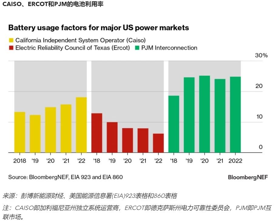 電池利用率受電池使用情況影響,也因地區(qū)而異。對于加利福尼亞州獨(dú)立系統(tǒng)運(yùn)營商(CAISO),由于市場多元化的商業(yè)模式,利用率波動很大;而在德克薩斯州,對于電力可靠性委員會(ERCOT),電池主要提供調(diào)頻服務(wù),因此電池平均利用率較低;在PJM互聯(lián)市場中,電池也主要用于調(diào)頻,但由于市場對電池的循環(huán)需求高,利用率往往相當(dāng)之高。