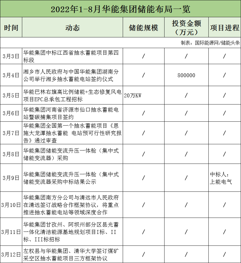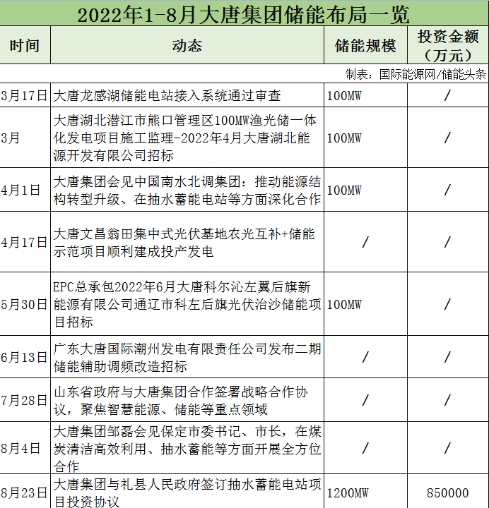 據不完全統(tǒng)計,2022年1-8月,大唐集團儲能項目招標3個,與山東、保定、南水北調集團等簽訂合作協(xié)議,涉及抽水蓄能、智慧能源等領域。