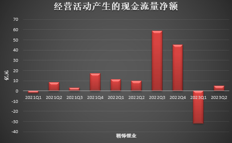 好在二季度,隨著鋰價(jià)在30萬元/噸企穩(wěn),中下游廠商在一季度過度去庫存以后,二季度的采購也有所回調(diào),贛鋒鋰業(yè)的經(jīng)營(yíng)活動(dòng)現(xiàn)金流因此也有所回暖,重新回歸正數(shù)達(dá)到4.78億元,但是相較去年同期的高景氣水平依舊有較大差距。
