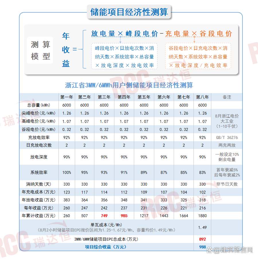 RCC瑞達(dá)恒研究院基于8月份的電價及儲能項目EPC中標(biāo)均價等數(shù)據(jù),以浙江省某化纖生產(chǎn)公司3MW/6MW的用戶側(cè)儲能項目為例進(jìn)行經(jīng)濟(jì)性測算得出:該項目約3.5年便可回收項目建設(shè)成本,按項目運(yùn)行周期8年測算,項目可為業(yè)主節(jié)省988萬元的電費(fèi)。