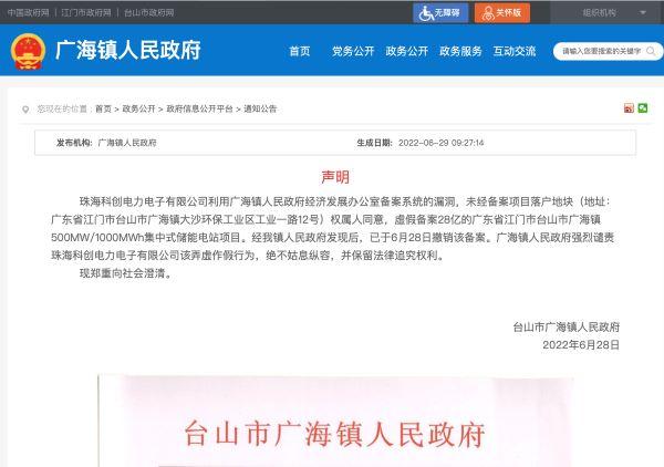 臺山市廣海鎮(zhèn)人民政府在2022年6月28日發(fā)布的一則聲明顯示:珠??苿?chuàng)電力電子有限公司(目前已更名為“珠海科創(chuàng)儲能科技有限公司”)利用廣海鎮(zhèn)人民政府經(jīng)濟發(fā)展辦公室備案系統(tǒng)的漏洞,未經(jīng)備案項目落戶地塊權屬人同意,虛假備案28億的廣東省江門市臺山市廣海鎮(zhèn)500MW/1000MWh集中式儲能電站項目。聲明稱,該鎮(zhèn)已于2022年6月28日撤銷該備案。