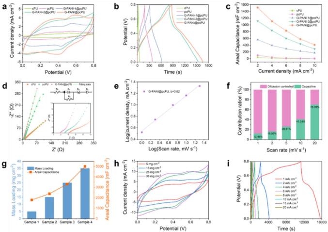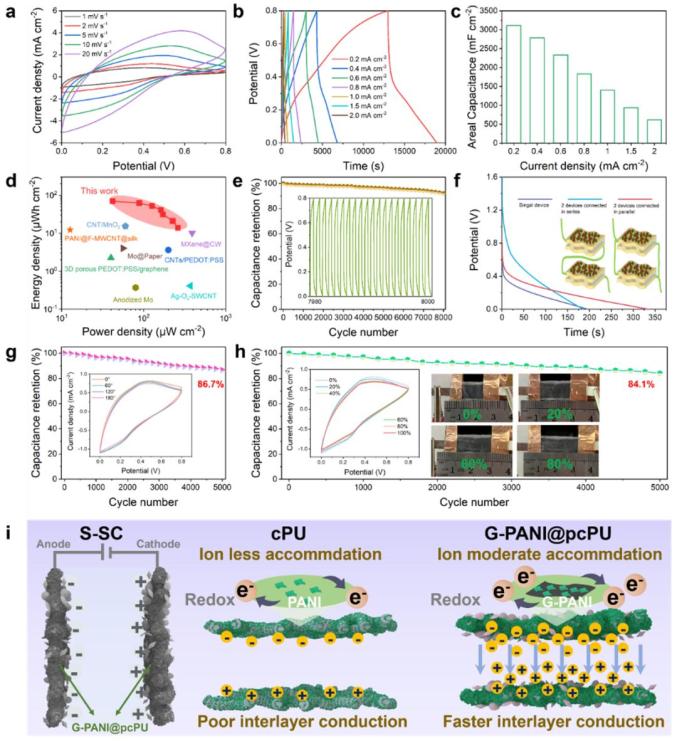 根據(jù)恒流充放電(GCD)曲線計(jì)算得出G-PANI@pcPU的最高面積比電容為1,512.5 mF cm−2(圖4c)。提高G-PANI在電極上負(fù)載量能有效提高電極的能量存儲(chǔ),面積比電容可達(dá)到5,093.7 mF cm−2(圖4g-i)。