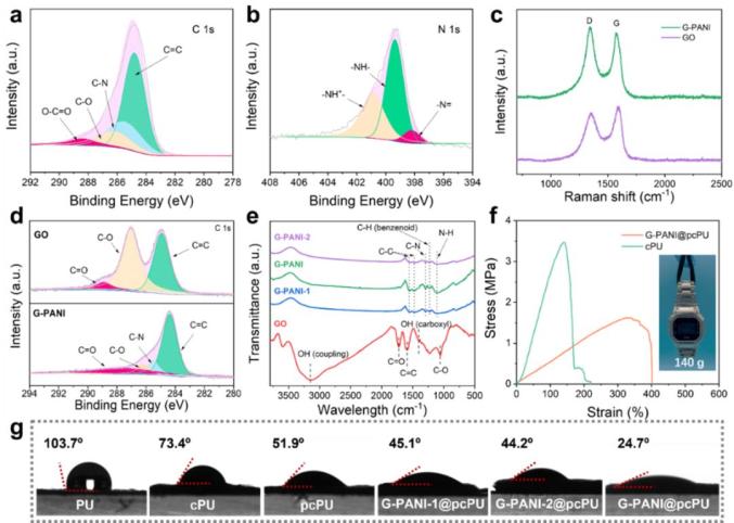 從圖3(a-e)的X射線光電子能譜、拉曼光譜和紅外光譜分析可以看出,苯胺成功還原GO生成G-PANI (圖3a-e)。G-PANI@pcPU的抗拉強(qiáng)度為1.61?MPa,斷裂伸長(zhǎng)率為401% (圖3f)。