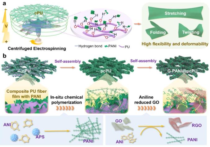 通過(guò)設(shè)計(jì)離心靜電紡絲化學(xué)和聚苯胺(PANI)誘導(dǎo)的兩步自組裝方法,制備了異質(zhì)結(jié)構(gòu)石墨烯-聚苯胺(G-PANI)錨定的聚苯胺修飾聚氨酯(pcPU)織物電極(G-PANI@pcPU)材料。
