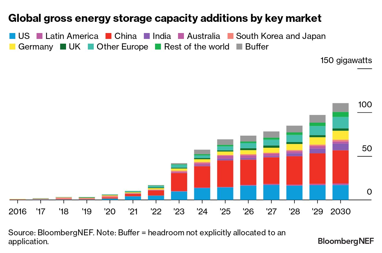 由于目標(biāo)和政策改革推動,彭博新能源財經(jīng)對中國2030年儲能部署預(yù)測的上調(diào)幅度