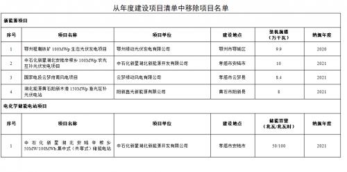 通知指出,為杜絕能源指標空轉、項目不落地等現(xiàn)象發(fā)生,湖北省能源局組織各地對納入2021年及以前年度建設項目清單的平價項目進行了清理,將4個風光發(fā)電項目及配建的1個集中式(共享式)電化學儲能電站項目從原年度建設項目清單中移除。其他未開工項目暫時保留建設指標,各地應組織項目單位抓緊落實前期條件,確保年底前開工建設。從年度建設項目清單中移除項目名單如下: