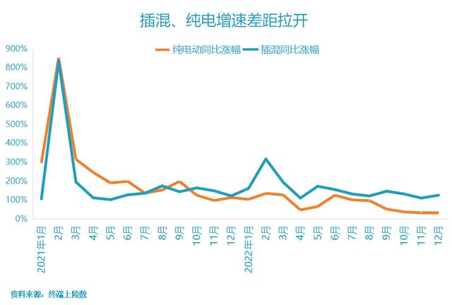 2022年開始,盡管新能源汽車增速仍然很快,但是純電和插混兩種車型增長(zhǎng)形勢(shì)大不相同了。