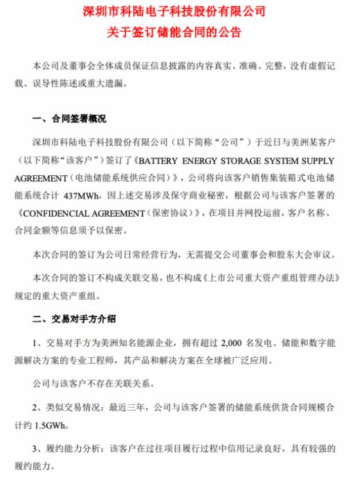據(jù)悉,交易對(duì)手方為美洲知名能源企業(yè),擁有超過2,000名發(fā)電、儲(chǔ)能和數(shù)字能源解決方案的專業(yè)工程師,其產(chǎn)品和解決方案在全球被廣泛應(yīng)用。公告顯示,最近三年,科陸電子與該客戶簽署的儲(chǔ)能系統(tǒng)供貨合同規(guī)模合計(jì)約1.5GWh。