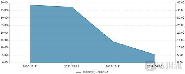 而細看公司儲能業(yè)務(wù)的毛利率,可以得知自2020年開始,該業(yè)務(wù)毛利率逐年下滑,其中2022年的下降幅度最為明顯。相關(guān)數(shù)據(jù)顯示,2020年—2022年及2023年上半年,儲能業(yè)務(wù)的毛利率分別為38.53%、37.17%、14.05%及5.41%。