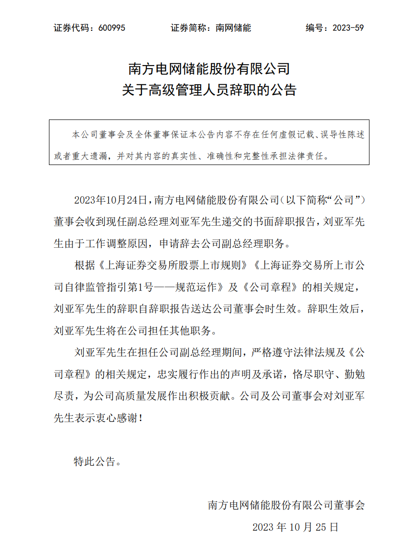南網(wǎng)儲(chǔ)能公告稱,10月24日,公司董事會(huì)收到現(xiàn)任副總經(jīng)理劉亞軍先生遞交的書面辭職報(bào)告,劉亞軍先生由于工作調(diào)整原因,申請辭去公司副總經(jīng)理職務(wù)。