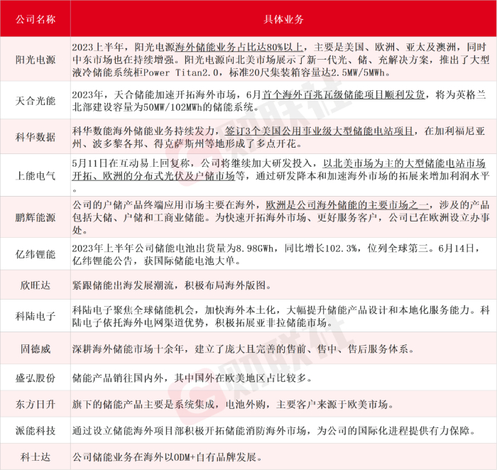 業(yè)內(nèi)人士表示,隨著2023年美國光伏裝機(jī)重新恢復(fù)增長及ITC補(bǔ)貼力度的加大,預(yù)計(jì)美國儲(chǔ)能需求將恢復(fù)翻倍以上的增速。對(duì)此,不少儲(chǔ)能企業(yè)紛紛加速“出海”,以全面進(jìn)軍海外市場為主要目標(biāo)。據(jù)財(cái)聯(lián)社不完全整理,在海外有布局儲(chǔ)能相關(guān)業(yè)務(wù)的上市公司主要為陽光電源、天合光能、科華數(shù)據(jù)、上能電氣、鵬輝能源、億緯鋰能、欣旺達(dá)、科陸電子、固德威、盛弘股份、東方日升、派能科技、科士達(dá)等,具體情況如下: