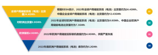 根據(jù)國(guó)內(nèi)產(chǎn)業(yè)機(jī)構(gòu)EESA統(tǒng)計(jì),2022年全球戶用儲(chǔ)能系統(tǒng)(電池)出貨量約為24.4GWh,其中對(duì)歐洲戶用儲(chǔ)能市場(chǎng)出貨量達(dá)到約9.8GWh;然而,2022年歐洲戶用儲(chǔ)能實(shí)際裝機(jī)4.6GWh,僅2022年底歐洲戶用儲(chǔ)能系統(tǒng)(電池)庫(kù)存約為5.2GWh。