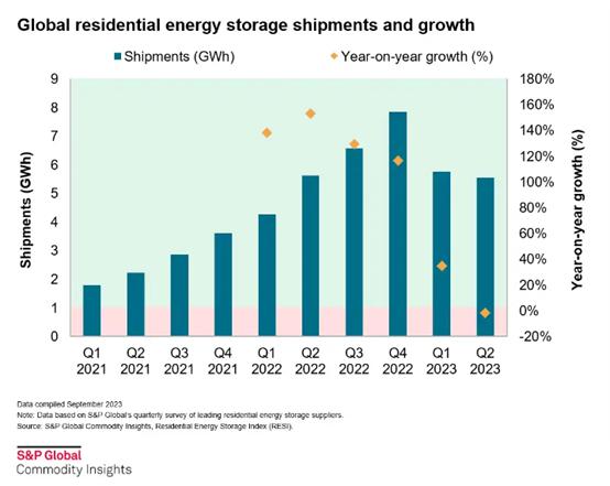 根據(jù)S&P Global Commodity Insights數(shù)據(jù),2023年Q2,全球戶用儲(chǔ)能出貨量較Q1下降了2%,這是戶儲(chǔ)有統(tǒng)計(jì)數(shù)據(jù)以來(lái)的第一次。
